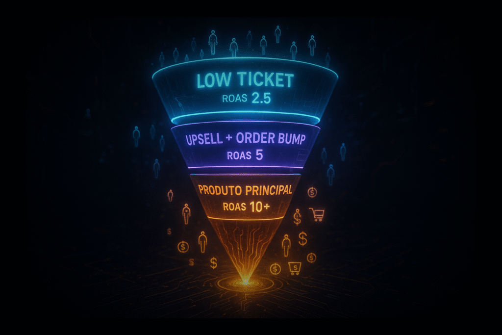 A primeira venda é só a porta de entrada: Depois que o pixel já está treinado, você guia o cliente por uma Escada de Valor: Upsells de velocidade e automação para aumentar o ticket médio. Acesso Premium e High Ticket para maximizar lucro. Recorrência para garantir estabilidade.